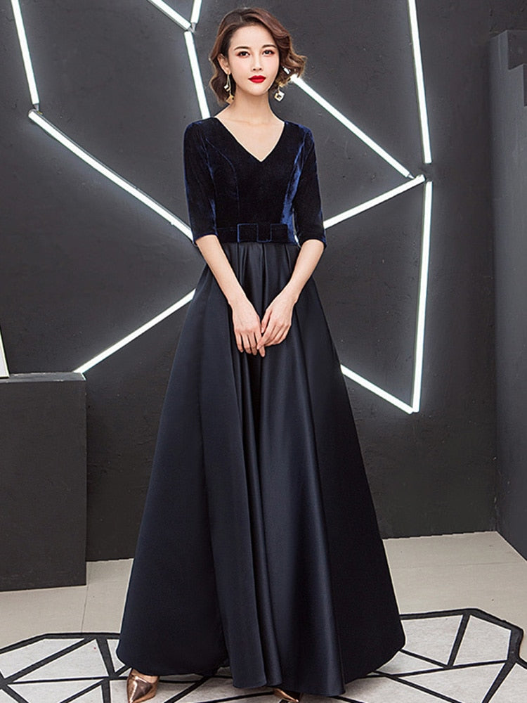sfaws™-V-neck Bow Waist A-line Satin Evening Dresses Short-Sleeve Velour Formal Women Prom Dresses Elegant Graduation Party Gowns