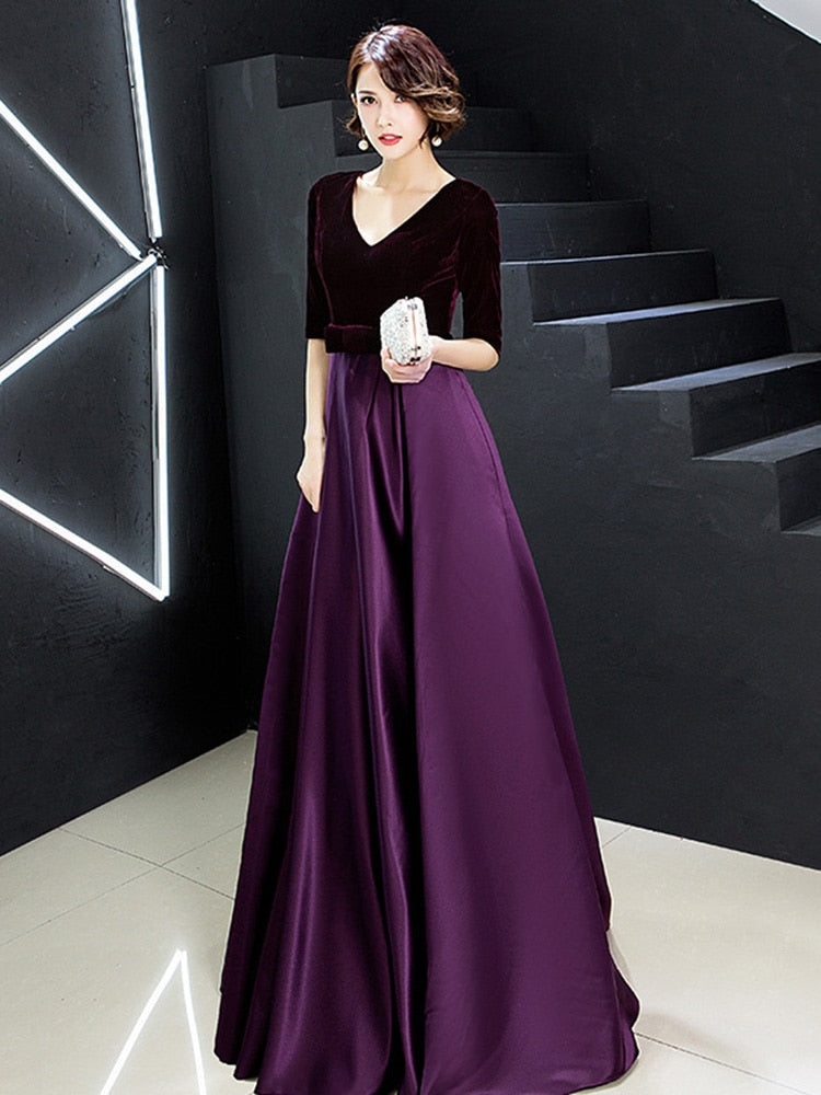 sfaws™-V-neck Bow Waist A-line Satin Evening Dresses Short-Sleeve Velour Formal Women Prom Dresses Elegant Graduation Party Gowns